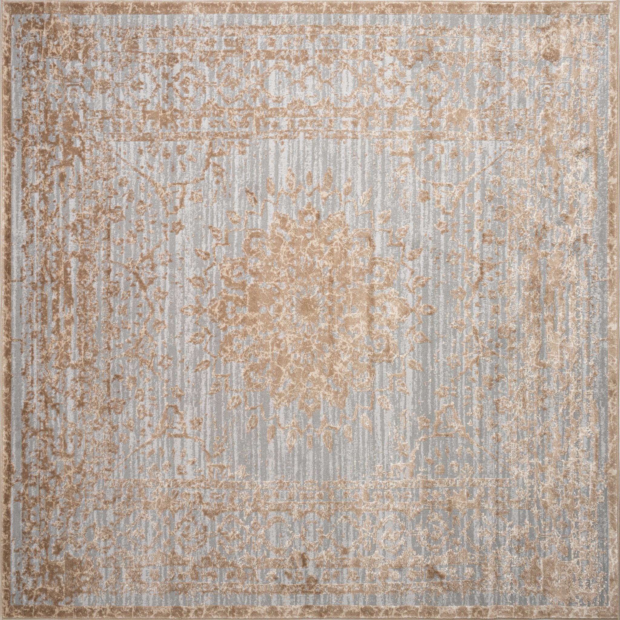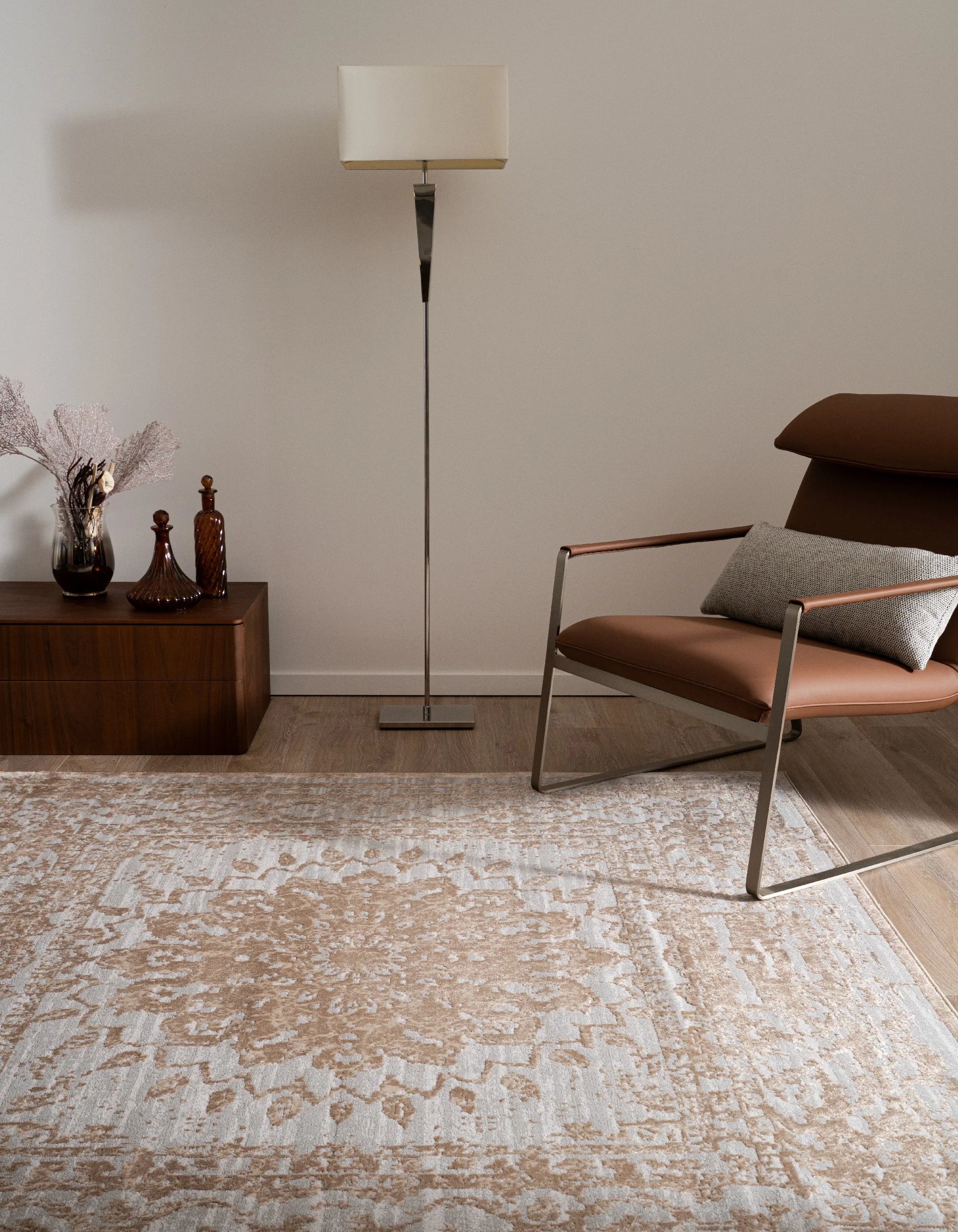 Elegantes Design: Die Bern Kollektion besticht durch seine schlichten Farben und den feinen Schimmer, der jedem Raum eine subtile Eleganz verleiht. Das zentrale, ornamentale Muster verschmilzt sanft mit dem modernen Distressed-Look am Rand und schafft so ein einzigartiges Designelement.